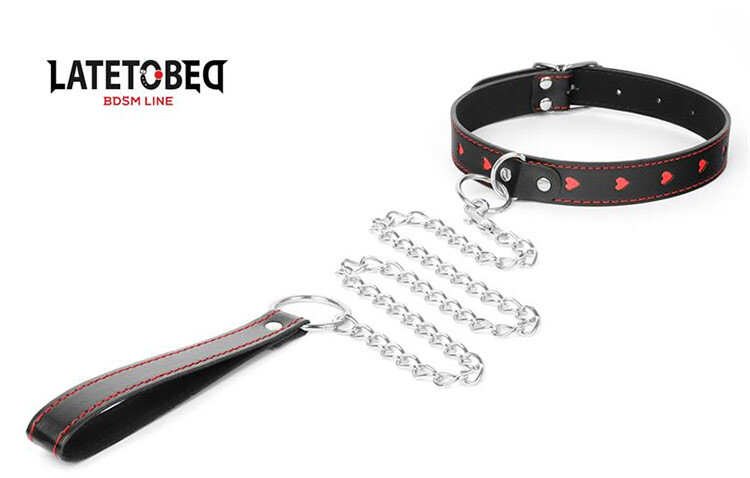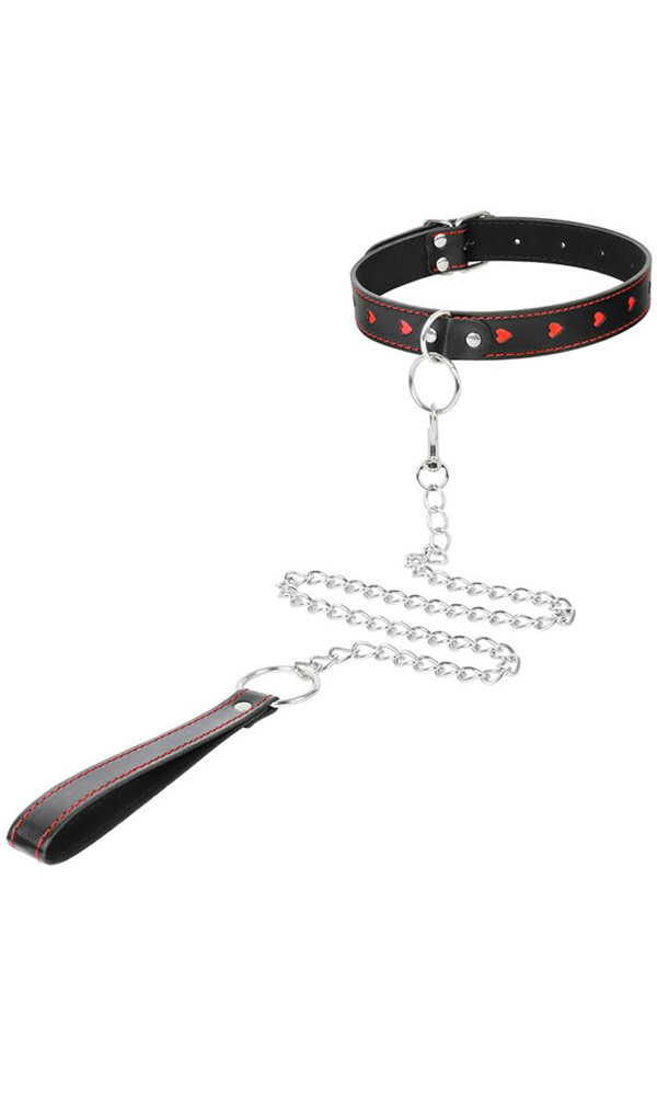 Emenez votre soumis où vous voulez avec ce collier à laisse. Le collier est orné de petits curs rouges.